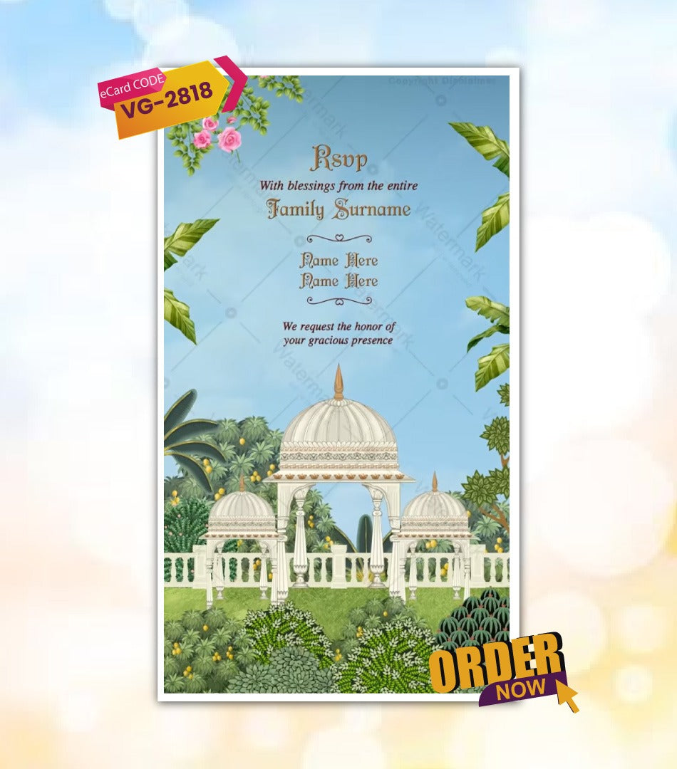 Add a refreshing and royal charm to your wedding announcement with this Caricature Couple Wedding Video Invitation, perfectly designed to capture the spirit of Mehndi, Haldi, Sangeet, and Vivah ceremonies. Set against a beautiful palace-style balcony with lush green mango trees, lotus flowers, and carved pillars, this video opens with a stylish couple monogram and vibrant natural elements. The setting is ideal for couples who want a traditional yet artistic invitation that reflects their grand celebration. Customise every detail—names, dates, event order, family blessings, and more. This animated video invite is tailor-made for digital sharing and brings elegance to your wedding announcement.