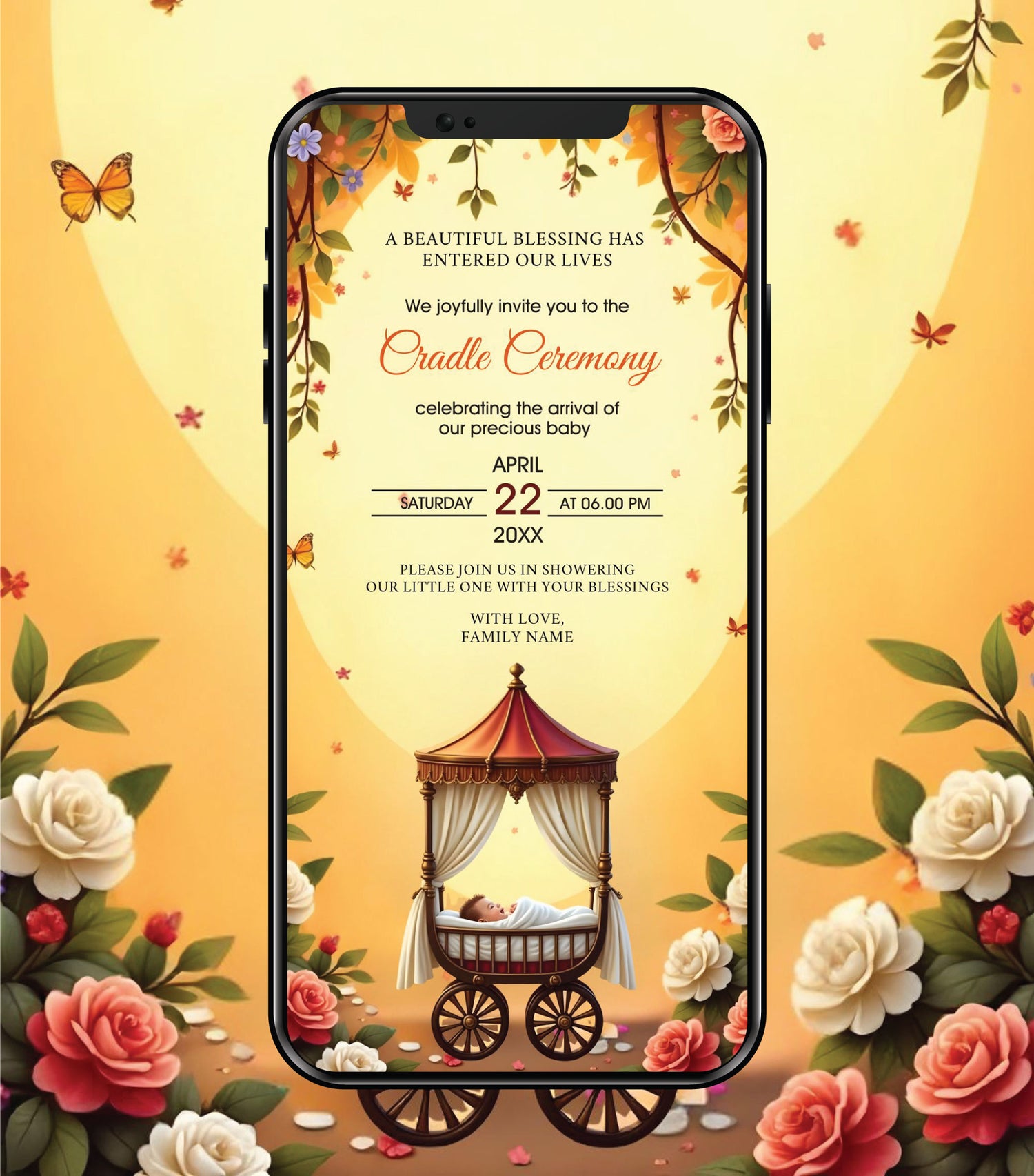 This digital invitation is ideal for cradle ceremonies, baby welcome functions, and early naming celebrations. The elegant vertical layout ensures that all important details—such as the ceremony date, time, family name, and venue—are presented clearly and beautifully.
