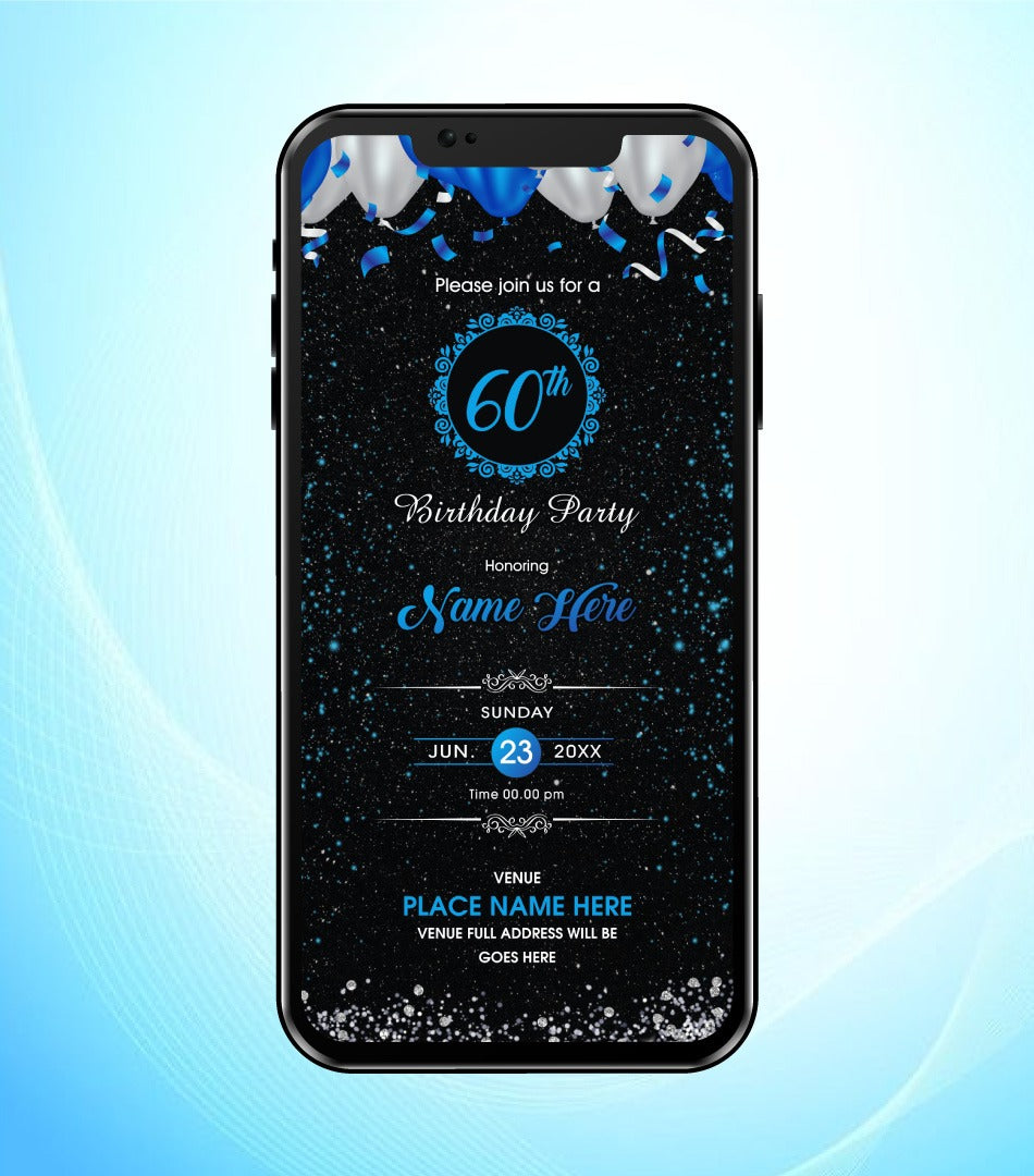 Celebrate 60 years of love, laughter, and memories with this elegant black & blue-themed digital birthday invitation! Designed for sophisticated milestone celebrations, this personalized e-card is perfect for inviting family and friends in a modern and stylish way.