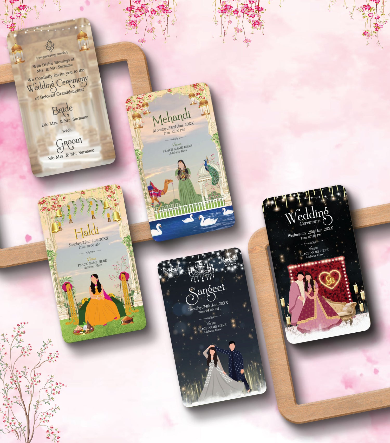 Announce your grand celebration in style with this Custom Caricature Wedding Video Invitation, tailored for multi-event Indian weddings covering Haldi, Mehndi, Sangeet, and the Wedding Ceremony. This elegant video features a royal temple-like background adorned with hanging lanterns, string lights, and a subtle Ganesh symbol at the top, invoking both blessings and beauty. The soft gold tones and traditional typography make this invite timeless and graceful. Customise every detail, including names, family blessings, event titles, and RSVP information. Whether you're hosting a classic ceremony or a full wedding weekend, this all-in-one video invite is designed to make a lasting first impression.